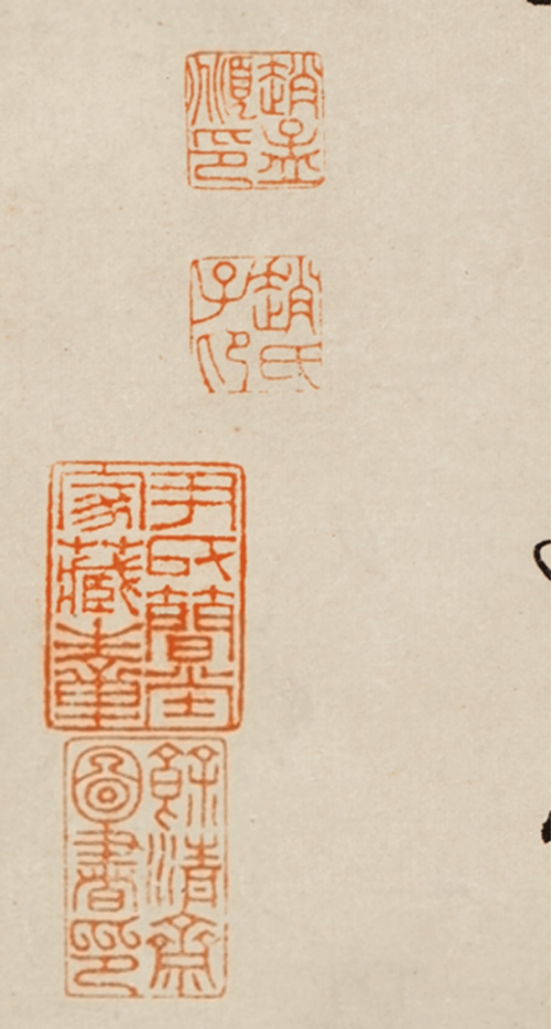 印章位置精准,不会阻塞画面高仿印章多为后刻,刀味死板,用朱太浓,甚至位置明显不合赵氏习惯。
